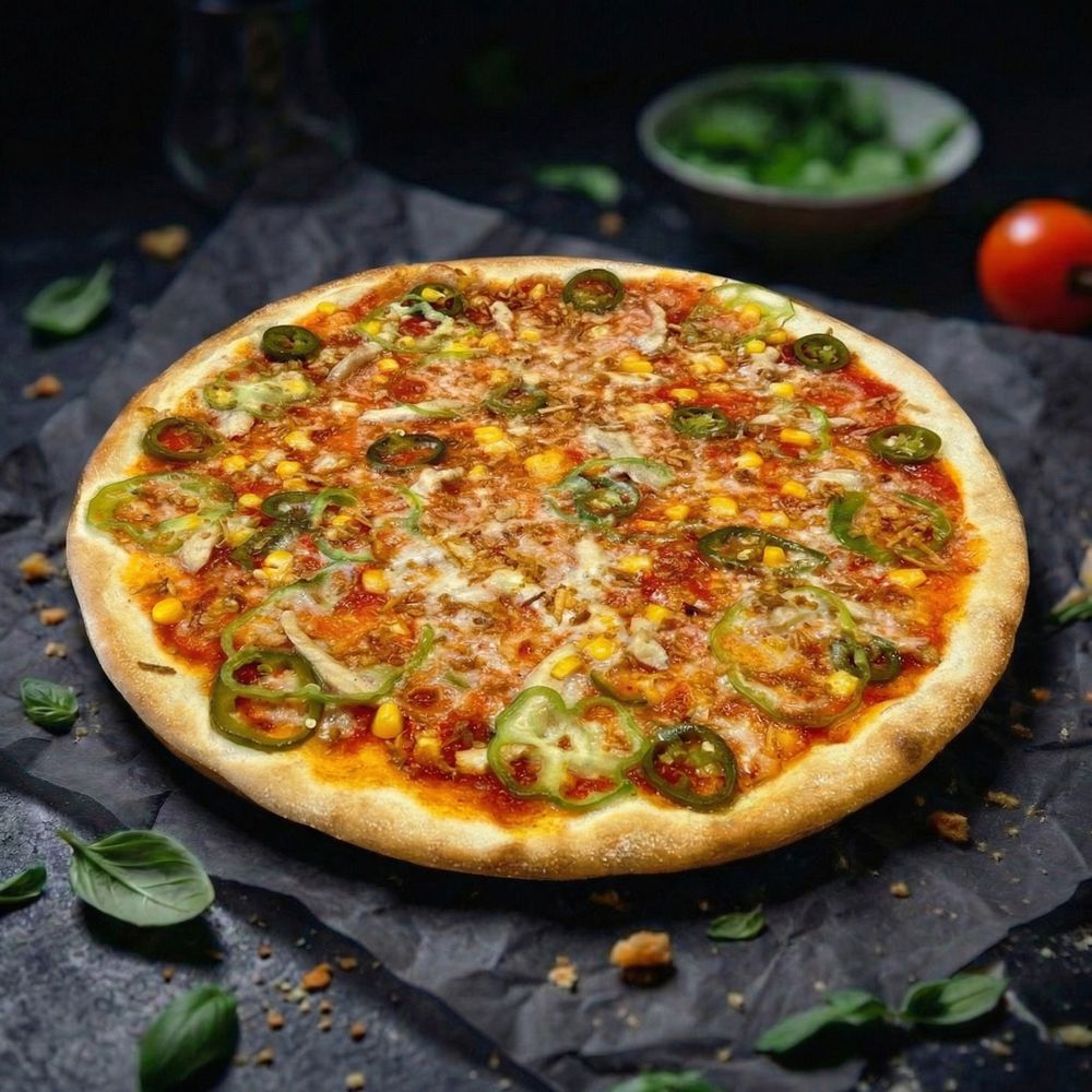 соус фирменный красный, сыр моцарелла, куриная грудка, кукуруза, халапеньо зелёные, перец болгарский, лук фри