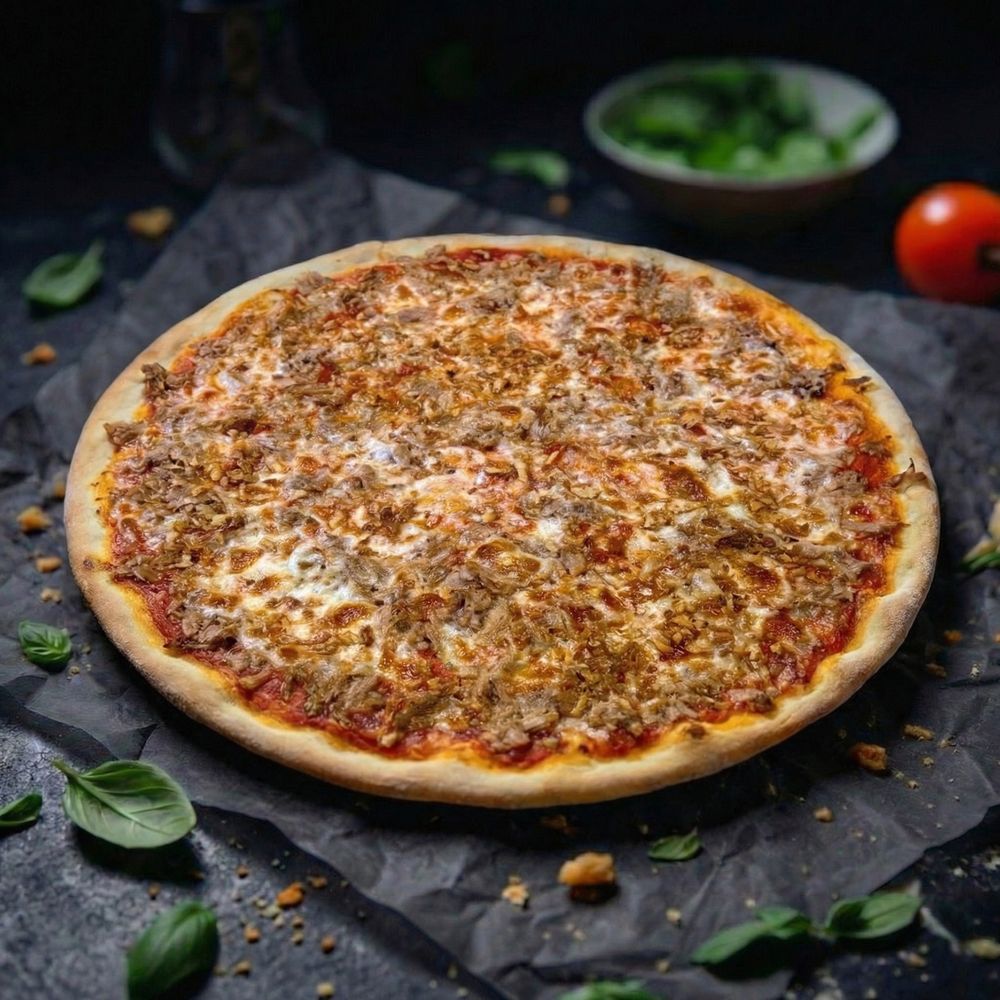 соус фирменный красный, сыр моцарелла, тунец, лук фри