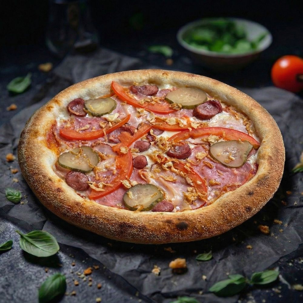 соус фирменный красный, сыр моцарелла, салями, бекон, баварские колбаски, маринованный огурец, томаты, лук фри