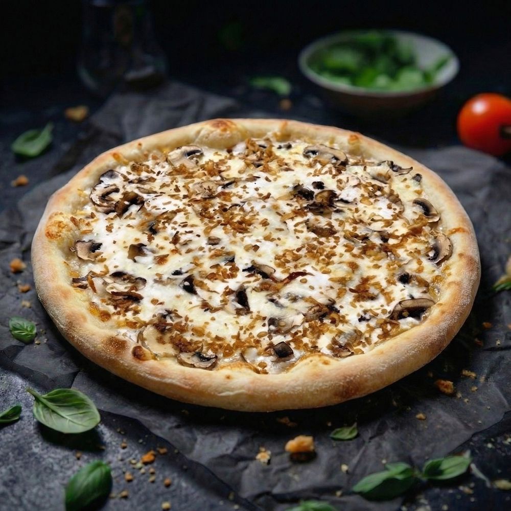 соус белый "Крем Чиз", сыр моцарелла, грибы, лук фри