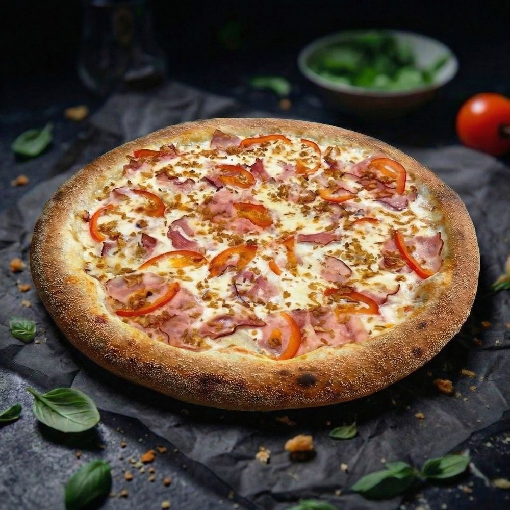 соус белый "Крем Чиз", сыр моцарелла, бекон, ветчина, томаты, лук фри