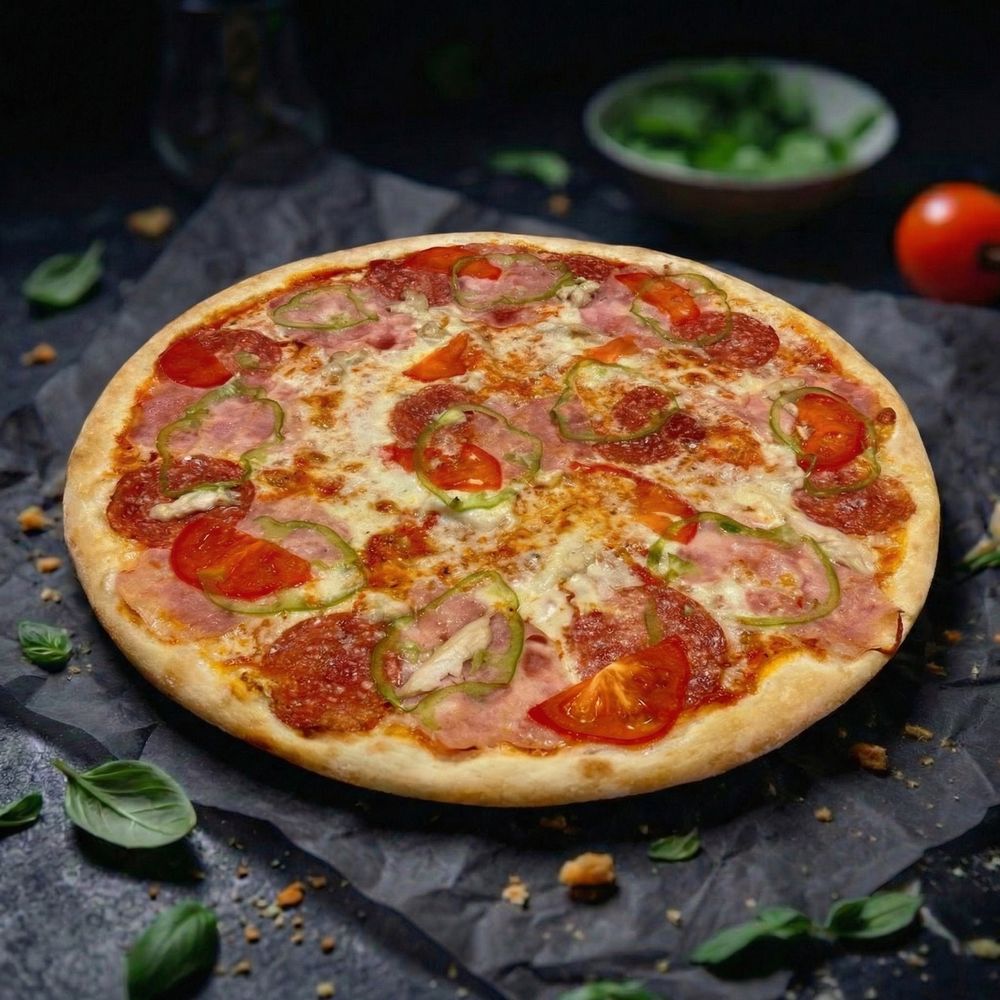 соус фирменный красный, сыр моцарелла, салями, ветчина, куриная грудка, болгарский перец, помидоры